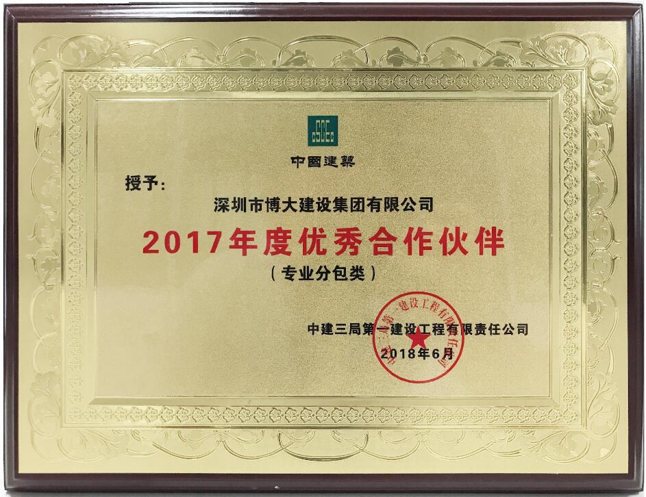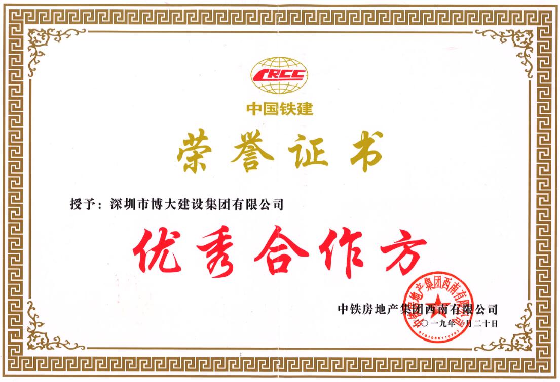 博大建設(shè)集團以優(yōu)秀的工程質(zhì)量和準時交期,協(xié)助中國鐵建奠定了西派國樾精裝大平層的品牌效應,榮獲中國鐵建優(yōu)秀合作方。