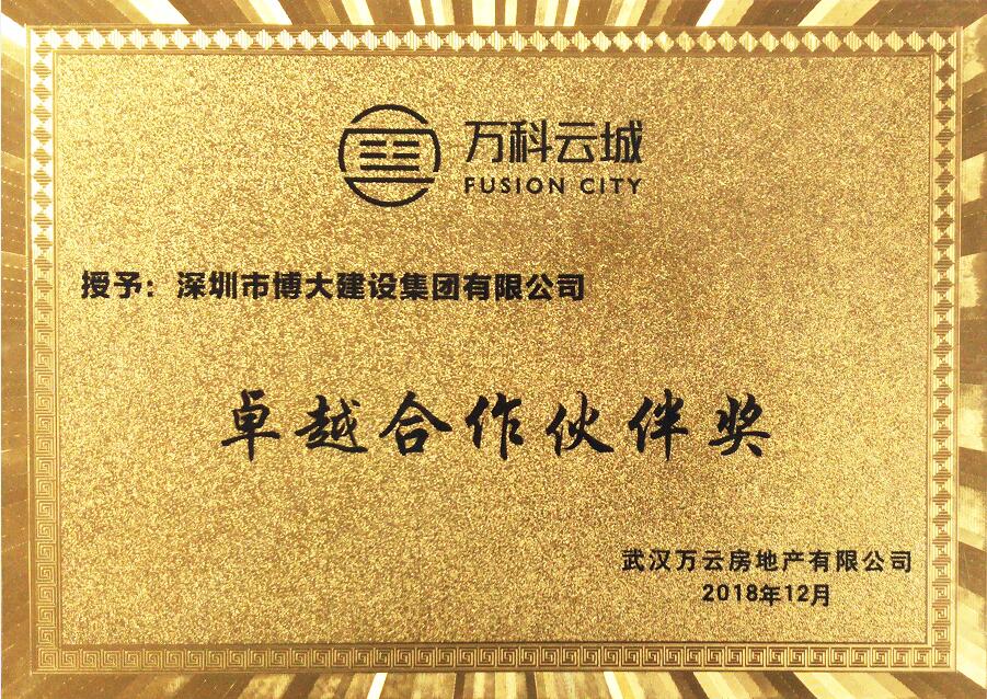 博大建設(shè)集團承建了禹洲集團湖北公司武漢賽洛城六期的精裝房工程,在武漢百盤維權(quán)的背景下,博大負責的精裝房一次性交房率達到98.41%,且工程質(zhì)量優(yōu)秀,幫助客戶成功避免了因交期、裝修質(zhì)量而造成的消費者維權(quán)風波。博大的綜合實力和用心服務贏得禹洲集團湖北公司的高度認可,榮獲2018年度優(yōu)秀合作獎。
