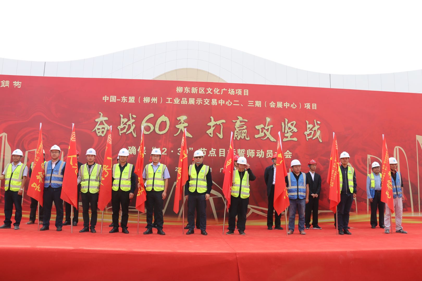 中國-東盟(柳州)工業品展示交易中心二三期(會展中心)項目工地現場宣誓聲響徹云霄。11月1日上午,柳州會展二、三期項目共同召開確保“12?30”節點目標誓師動員大會,博大建設集團作為重要參建單位,集團董事、副董事長黃河親臨現場,與甲方簽訂“軍令狀”。