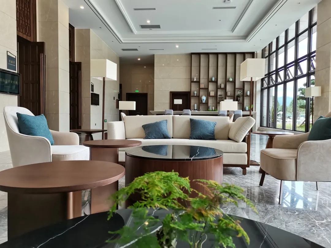 貴州山水特色“小時不識月,呼作白玉盤”,盤州月亮山莊酒店以“月”為主題,處處彰顯“月”的文化元素,“滿月”的石材造型屏風(fēng),用米黃色大理石干掛制作而成,表現(xiàn)“月”的圓滿,溫潤,也需要對石材獨具匠心的制作工藝。