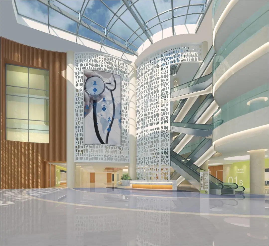 住院大廳天棚采用大面積玻璃采光頂,節(jié)約采光成本的同時營造廣闊的視覺空間。墻面采用仿石材瓷磚,與石材地面銜接,穿插氟碳烤漆鋼板柱子,通過對點線面的梳理,凸顯簡約、大氣、通透、現代化的視覺美感。