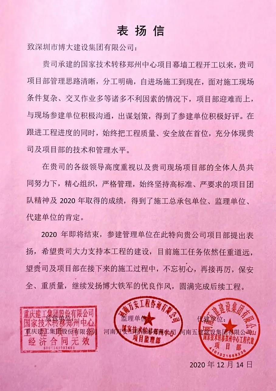 將履約視為生命!這是博大人的莊嚴承諾和工作準則。12月14日,博大建設(shè)集團國家技術(shù)鄭州轉(zhuǎn)移中心項目部憑借優(yōu)質(zhì)的履約能力贏得總包單位重慶建工集團、代建單位河南五建建設(shè)集團、監(jiān)理單位河南萬安工程咨詢公司等三方的高度認可,并致集團總部以表揚信!