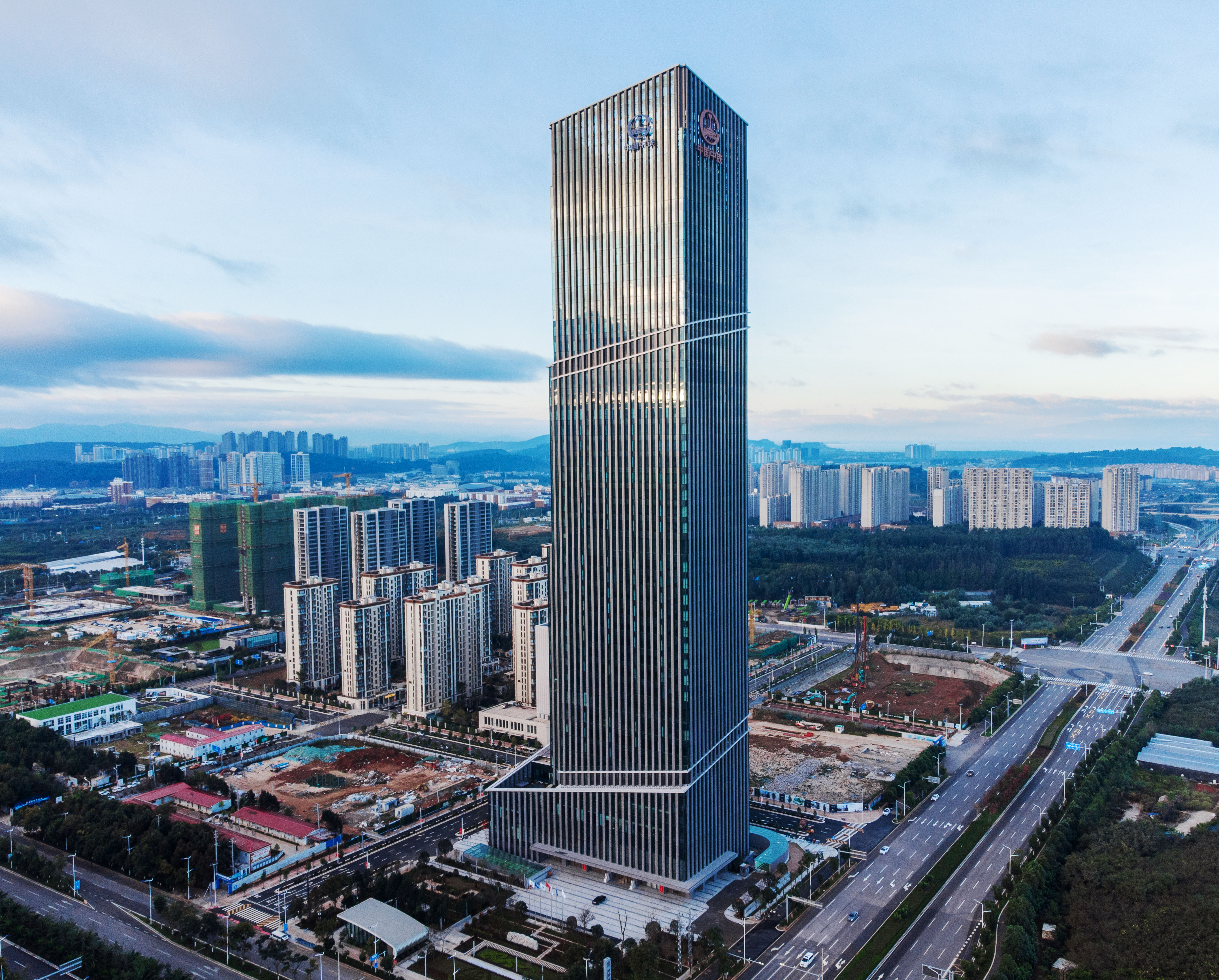 大廈通過層層升起的建筑形體形成退臺式屋頂花園,將彩云南路綠軸立體化至建筑空間,并在頂層與滇池景觀形成呼應。建筑造型取意于極具云南地方特色的“竹筍”,寓意“節節高”,展現中國中鐵股份有限公司“勇于跨越,追求卓越”的企業精神。